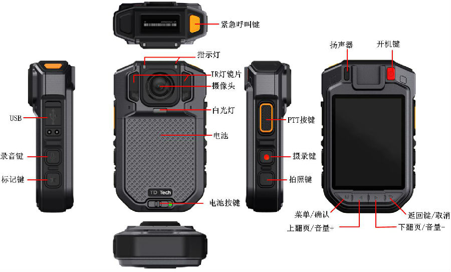 按键  :   开关机,拍照,录像,录音,SOS,PTT,功能按键,菜单键,确定键,上按键,下 按键